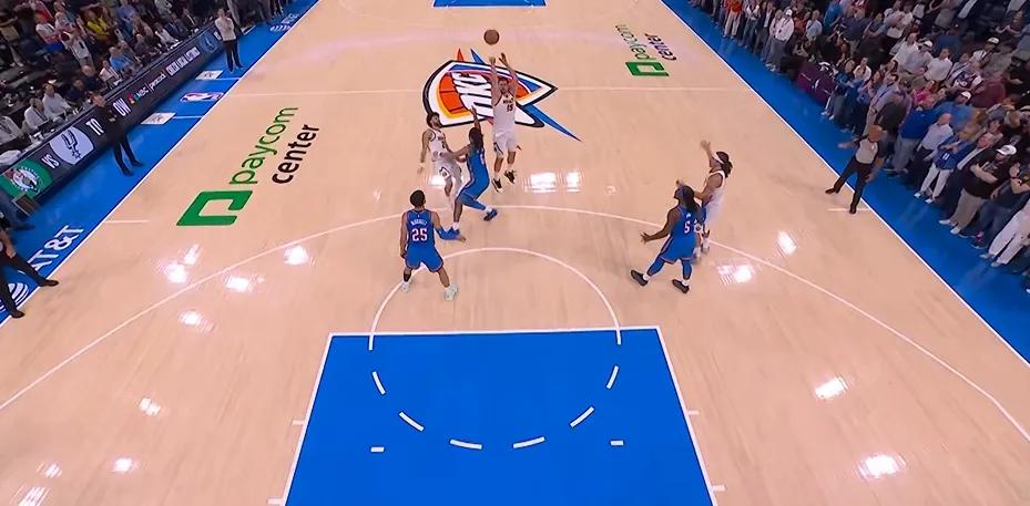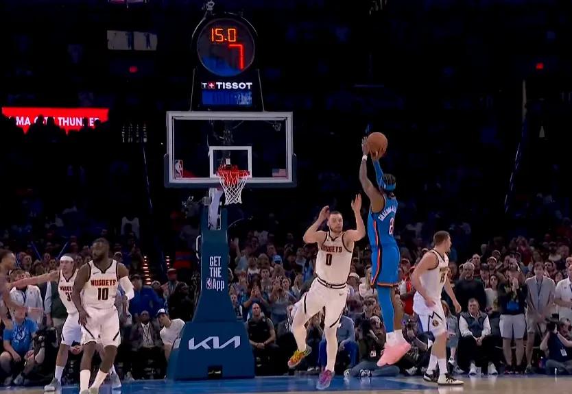 Ten days ago, the Thunder beat the Nuggets in overtime, but today, Alexander didn't let the game reach overtime. With 8.6 seconds left, Alexander received the inbound pass, and the Nuggets switched to Spencer Jones to defend him solo. Alexander stepped back for a three from the 45-degree angle and hit it again! A dagger to seal the win.