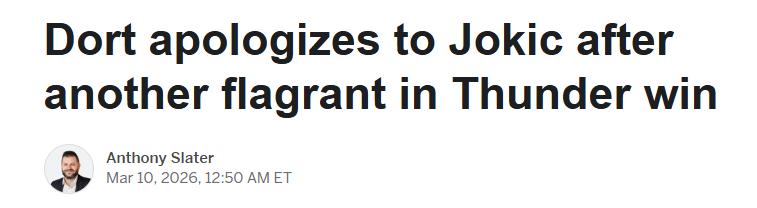 On March 10 Beijing time, according to ESPN, Thunder player Dort admitted that he has apologized to Jokic after committing a flagrant foul against him in the fourth quarter for the second time in two weeks.