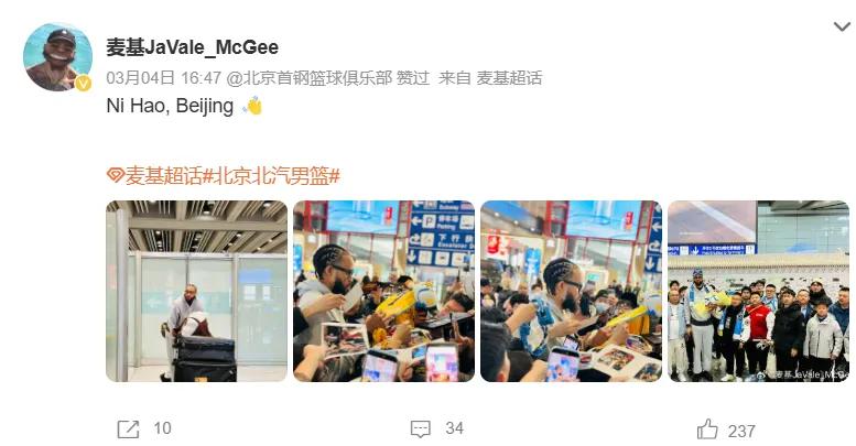 Before the start of the second stage this season, Beijing team completed McGee's registration at the buzzer, meaning he can play in the CBA from today. He is expected to make his debut this Wednesday in the home game against Sichuan, the bottom-ranked team in the league.