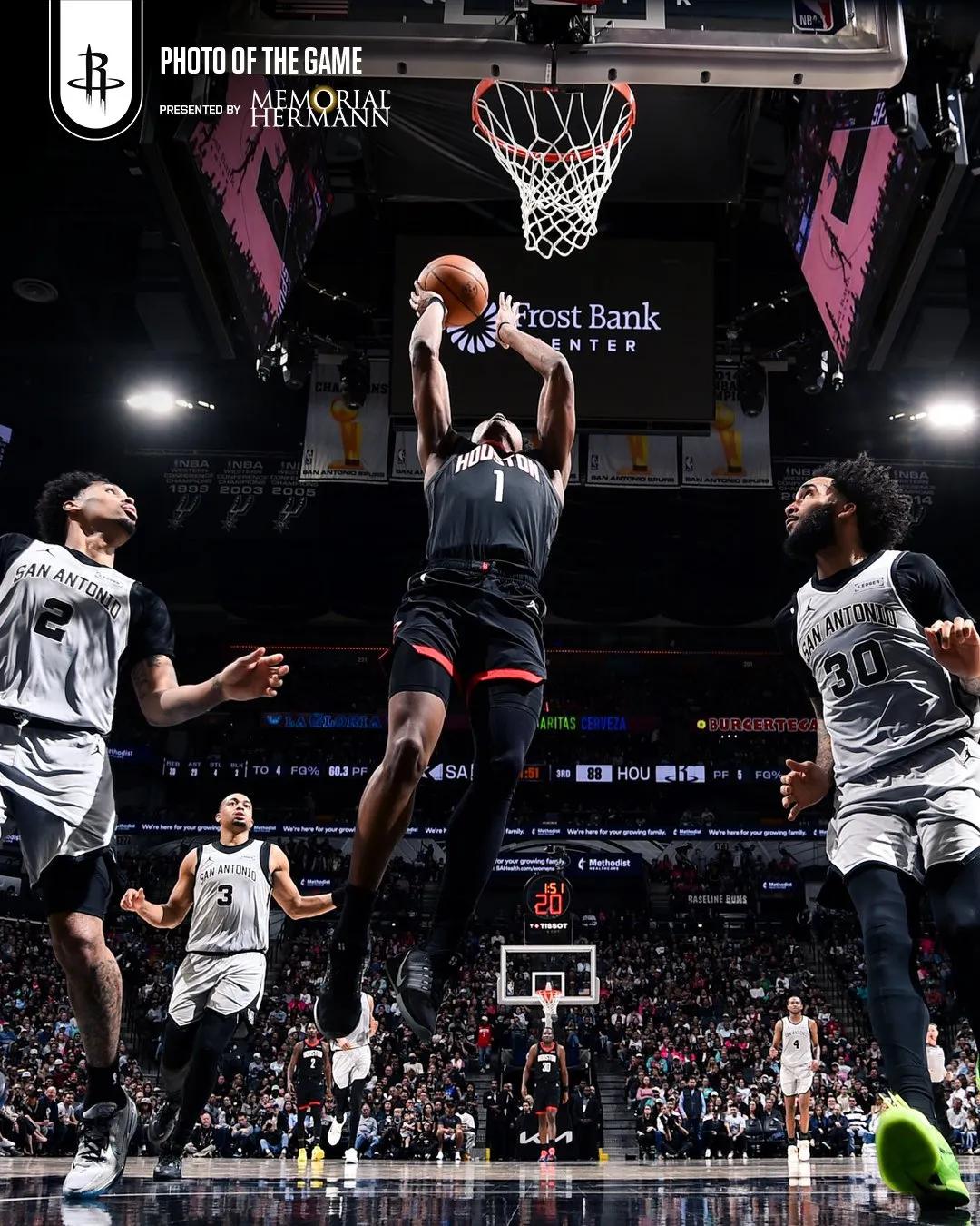 Because the Rockets lack three-point shooting, Durant faces at least double-teams when he gets the ball, sometimes even triple coverage. Durant was harassed painfully today, with only 12 shot attempts. Amen, however, took 15 shots, as opportunities naturally came to him. Although Amen scored 23 points, it didn't truly hurt the Spurs.