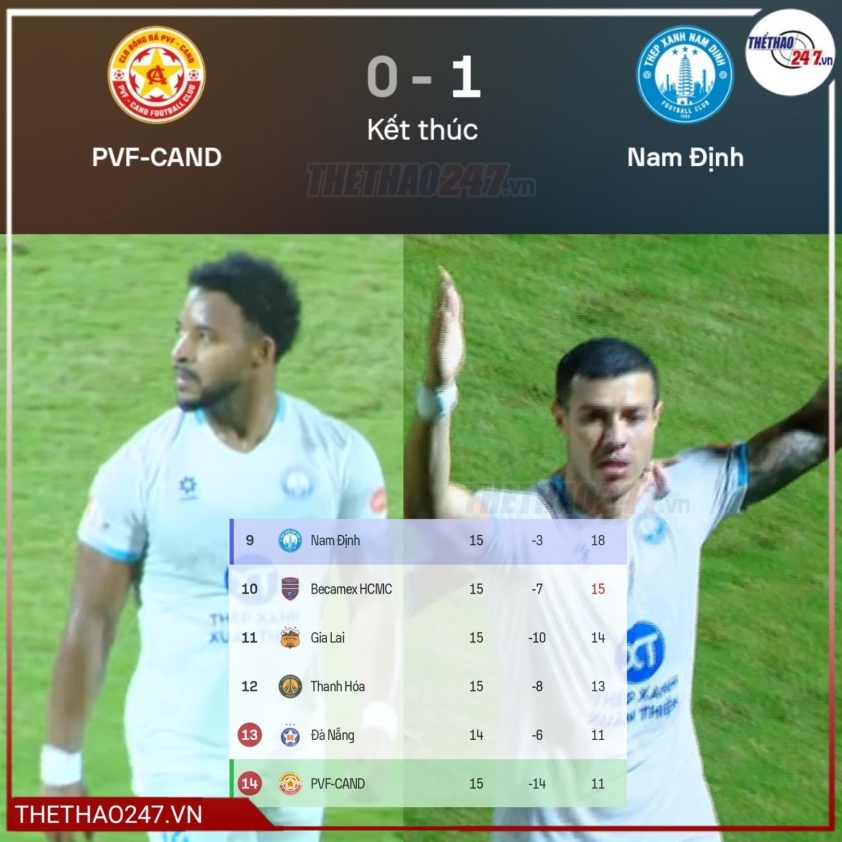 At home, PVF-CAND played with great effort and organized a solid defense against Nam Dinh's continuous pressure. However, a late goal in the 89th minute by defender Lucas Alves left PVF-CAND empty-handed and dropped them to the bottom of the standings.