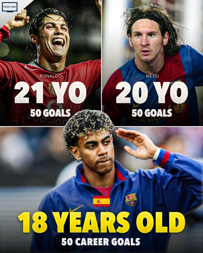 For comparison: Messi scored his 50th career goal in 2008, at 20 years and 315 days old, while Ronaldo reached this milestone in 2007, at 21 years and 297 days old. Thus, Yamal has reached this milestone more than two years earlier than Messi and almost three years earlier than Ronaldo.