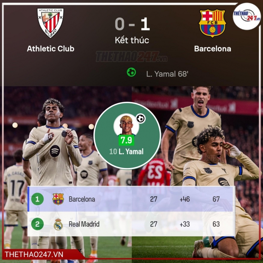 After being eliminated from the Copa del Rey by Atlético Madrid, Barcelona needs to quickly regain their spirit to continue the La Liga title race. The Catalan squad marched to San Mamés Stadium to face Athletic Bilbao, and Yamal created the decisive moment. In the 68th minute, following a precise pass from Pedri, Yamal executed a neat curling shot to score the sole goal, securing a 1-0 victory for Barcelona.